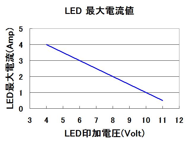LEDの両端に印加する電圧が V(Volt)の時、LEDに流れる最大電流 I (Amp)を図の直線以下の領域でご使用ください。パルス幅は、最大1msecで繰り返しは、Duty 1%以下でご使用ください。 |