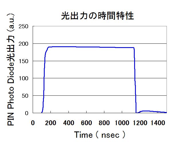LEDを短パルス(内部回路でつくられた1μsec幅のパルス)にてドライブした場合の時間特性です。LEDは、パルス電流 1Amp (@LED印加電圧=10.3Volt)で光出力3 Wです。光測定は1.5GHzのPIN PhotoDiodeです。立ち上がり時間は、50nsecです。なお、ご使用になるLEDによって光の最短パルス幅や立ち上がり時間は異なります。 |