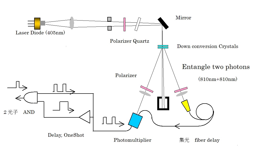 Laser Diode (405nm)のレーザ光が、Down Conversion Crystal (非線形結晶BBO)に入射すると、その非線形の効果により、2つの双子の光子が同時に発生します。これらの光子の波長は、405nmの倍の810nmになります。この光子対は、量子もつれあい状態にあり、一方の性質が決定されれば、他方の性質も”同時”に決定されるといわれております。ここでは、1つの光電子増倍管で2つの光子を計測しております。一方の光子は集光されて、光ファイバーに入射され、約30nsecほど遅らされて、光電子増倍管に入射します。光電子増倍管の時間分解能は約10nsec以上あるため、光子ペアの信号は、2つのパルスとなり分離されます。そして、回路により、2つのパルスが発生しているか調べることで、2光子発生の実験(アインシュタインーポドロフスキー,ローゼンのパラドックス)の検証が可能です。価格はおおよそ50万円におさえられるため簡単な実験が可能です。
