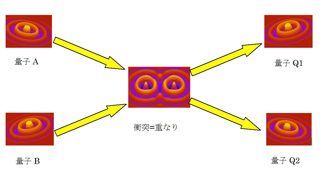ここで、右上がQ1,右下がQ2となずけます。これを粒子としてみれば、Q1,Q2は、AかBであり、Aを追跡できれば、Q1かQ2に行くことがわかります。所が、粒子でなく波動だとみれば、2つの波動は中心で重ね合わさったために(エンタングル状態)、Q1,Q2は、どちらがAかBかを指定できなくなります。ここで、最初、A,Bは、ある性質をもっており、その性質(スピンと呼ぶ)が、Aは、+1、Bは、−1だとしましょう。A,B全体では、0であり、これは衝突前後でかわらない保存数です。