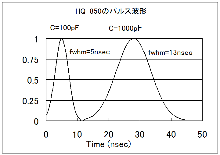 ・ドライバーには、最大1MHzパルス発信器が内蔵されており、ナノパルス発振が可能です。パルス幅は、コンデンサーにより最低5nsecです(*LEDに依存)。右の表は、1000pFの場合です。
